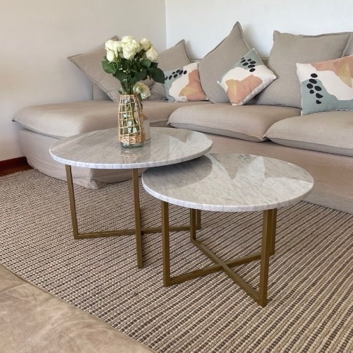 Mesa de centro de diseño contemporáneo, con cubierta de mármol natural y base de madera nativa. Sus líneas curvas y textura aportan carácter y calidez al espacio, convirtiéndola en una pieza protagonista del living. Fabricación a medida, con opción de personalizar dimensiones y color de madera.